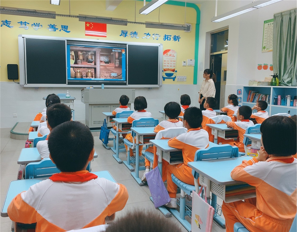 古老编钟的美好,来源于其声音清脆而不尖利,无鼓之浑厚,轻灵而悠远。课堂上老师首先图片展示“曾侯乙编钟”,让孩子们猜测乐器的名字,然后带着疑问欣赏有关编钟历史的小视频。