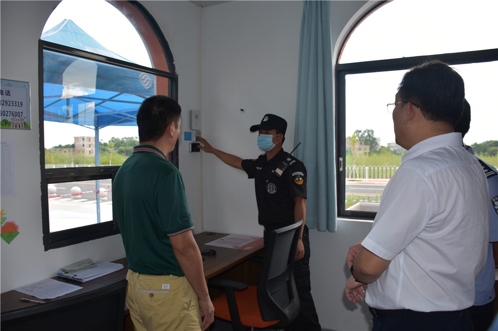 李书记一行在黄广增城学校执行董事薛来武、校长蒋晓明陪同下,察看了学校校园周边治安情况、消防安全设施情况,详细了解学校校门保安室安保相关工作的管理实施情况。